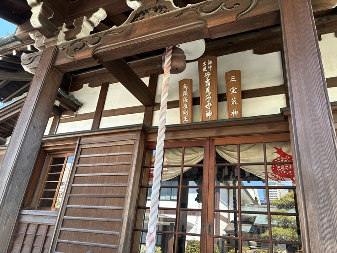 路地裏から戻った先に因速寺があります。因速寺は、元和九年(1623年)に釈定玄法師によって開山されました。元々は京橋竹町(現在の中央区京橋)に位置していましたが、その後木挽町(現在の中央区銀座)に移転し、最終的に深川黒江町(現在の江東区永代)に落ち着きました。しかし、大正十二年(1923年)の関東大震災で罹災し、昭和二年(1927年)に現在地に移転しました。因速寺の御本尊は木造阿弥陀如来立像です。