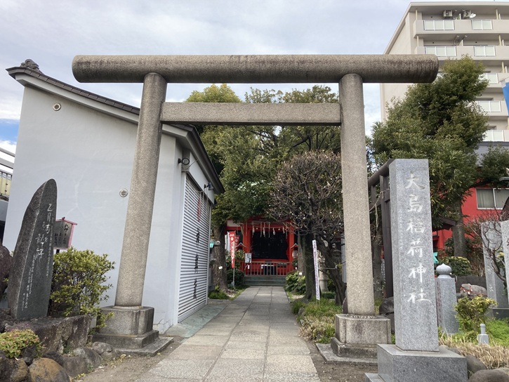 仙台堀川公園に戻り、小名木川に架かる塩の道橋袂から川沿いの遊歩道を進みます。丸八橋を渡った右手に大島稲荷神社(大島神社)があります。