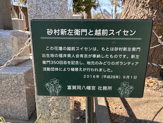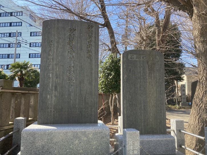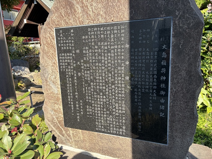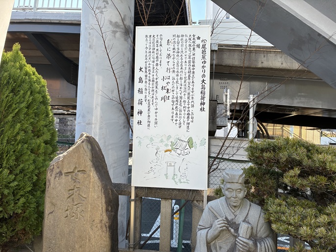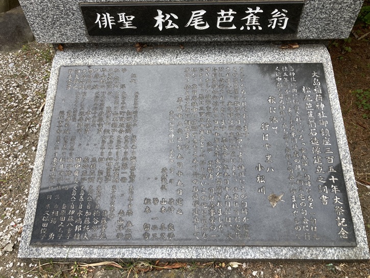 芭蕉の石造像の後ろにも、芭蕉と大島稲荷神社の関わりを書いた案内板が建っています。