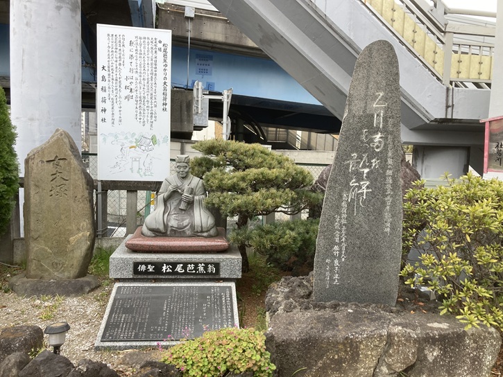 としたためられております。その後芭蕉翁歿後其日庵(きじつあん)社中により神社にこの句碑が建立されました。本句碑は歴史的価値により、江東区有形文化財に登録されております。平成十三年九月十九日には、大島稲荷神社御鎮座三百五十年式年大祭が開催されました。輝やかしい佳節を迎え総代、氏子、崇敬者一同記念事業の一環として、茲に三百五十年史として縁り深いこの地に遺徳を偲び、其日庵社中に感謝の意をこめて翁の石造像建立して後世に伝えることに相成ました。
