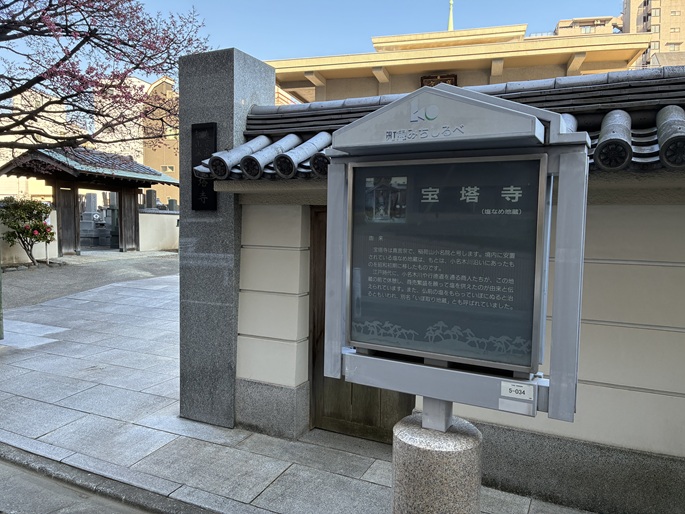 慶長十五年(1610年)に法印賢意が創建した真言宗智山派寺院の宝塔寺は、稲荷山小名院と号します。宝塔寺には江東区登録文化財が多数あり、その中でも江戸時代の商人が商売繁盛を願って塩を備えたことが由来の「塩なめ「地蔵」が有名です。また仏前の塩をもらっていぼにぬると治るともいわれ、別名「いぼ取り地蔵」とも呼ばれています。