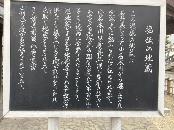 この塩舐め地蔵は、石井某によって小名木川から掘り出され、宝塔寺に納められたと伝えられます。小名木川は慶長年間に開削されており、おそらく宝塔寺の開創(慶長十五年・1610年)とともに境内に安置されたものでしょう。塩地蔵とよばれる地蔵尊はきわめて数少なく、供えられた塩をつけると疣が取れるといわれ、疣取り地蔵ともよばれます。また、商売繁昌、航海安全のご利益も授かると伝えられています。