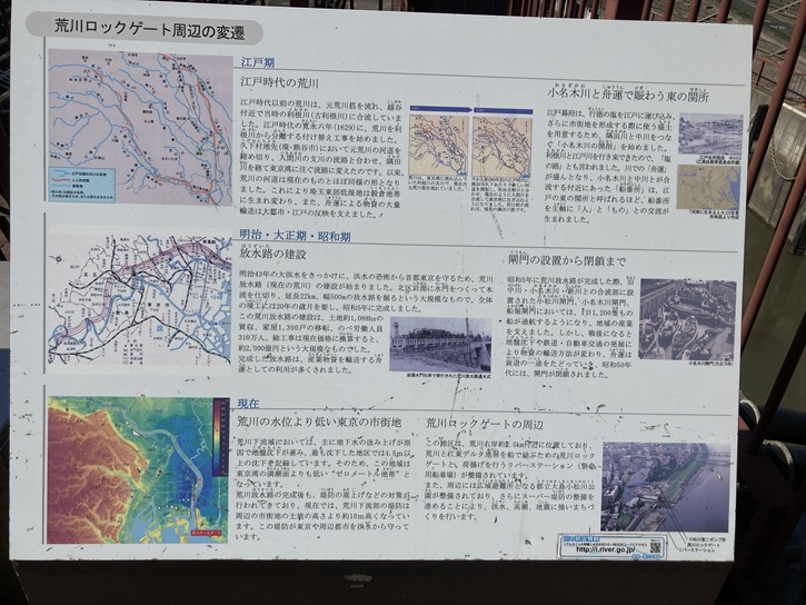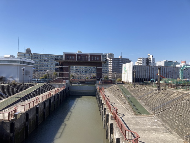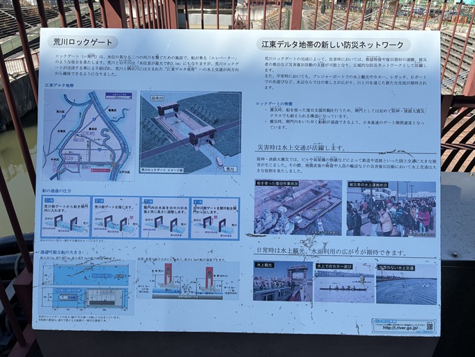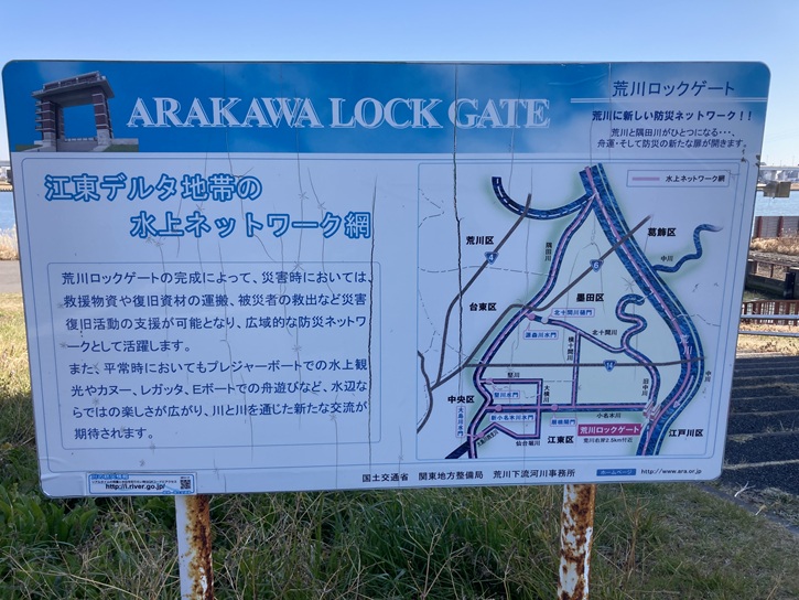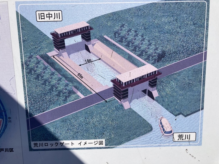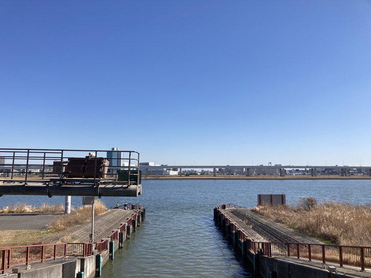水面の高さが違う荒川と旧中川は、ロックゲートのお陰で船が行き来できます。