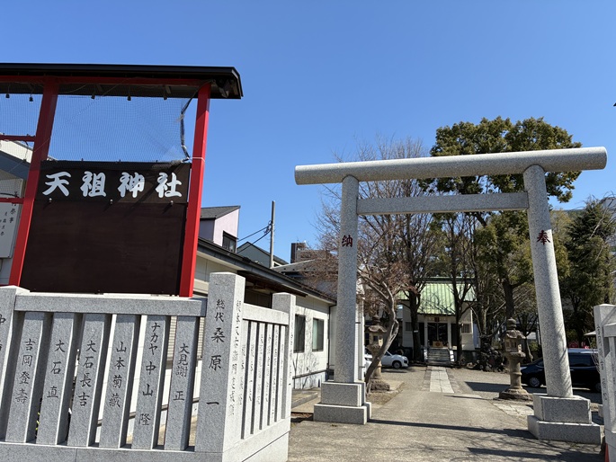 「コ」の字型に回って、再び仙台堀川公園横の道路に出る手前に大塚天祖神社があります。この辺りは江戸時代に開拓された砂村新田地域で、その東隣にあったのが大塚新田でした。大塚天祖神社は、寛永年間(1624年〜1644年)にこの地が開拓された時に勧請されて大塚の鎮守となりました。境内には「神明の松」と名付けられた大きな松の木があり、木の下には元神明の碑がありました。「大正六年(1917年)の大津波」が起きた時は、その松にしがみついて助かったものが何人もいたということです。しかし、松の木はそののち枯れてしまったのだそうです。
