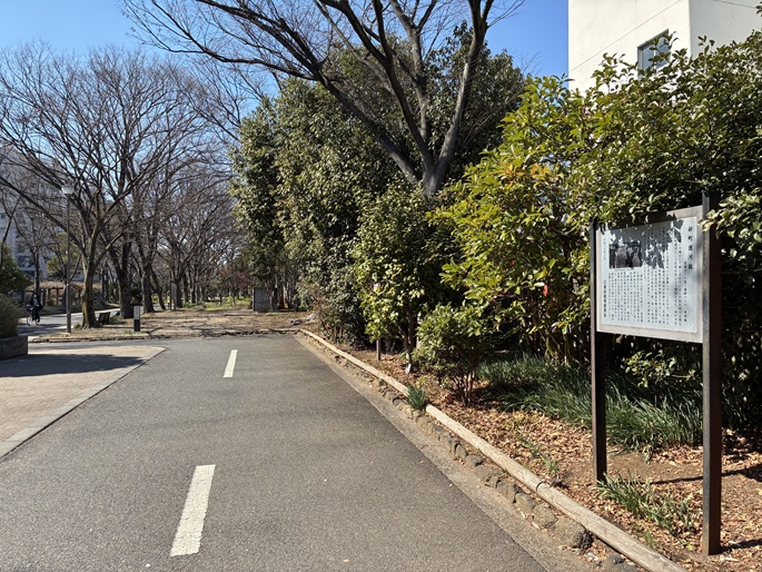公園がL字型になった地点から西方向に幅の広い遊歩道が延びています。ここには、かって砂町運河がありました。