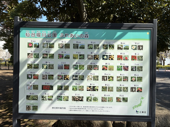 「ふれあいの森」には、全国の都道府県から集められたそれぞれの県花・県木が植樹されています。ちなみに、江東区の県花はサザンカで、県木はクロマツです。