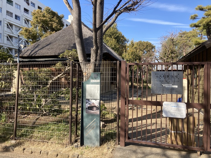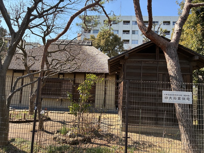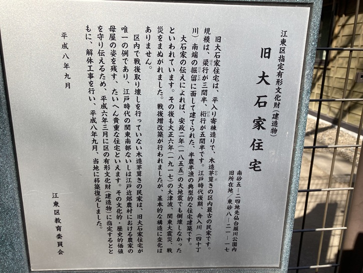 旧大石家住宅は、平入り寄棟造りで、木造茅葺きの区内最古の民家です。規模は、梁行が三間半、桁行が五間半です。江戸時代後期、舟入川(四十丁川)南端の堀留に面して建てられた、半農半漁の典型的な住宅建築です。大石家の伝えによれば、安政二年(1855年)の大地震でも倒壊しなかったといわれています。その後も大正六年(1917年)の大津波、関東大震災、戦災をまぬがれました。戦後増改築が行われましたが、基本的な構造に変化はありません。区内で戦後取り壊しを行っていない木造茅葺きの民家は、旧大石家住宅が唯一の例であり、江戸時代の関東南部ないしは江戸近郊農村における農家の母屋の姿を残す、たいへん貴重な住宅といえます。その文化的・歴史的価値を守り伝えるため、平成六年三月に区の有形文化財(建造物)に指定するとともに、解体工事を行い、平成八年九月、当地に移築復元しました。