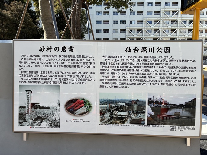 大正期以降は工業化・都市化により、農業は減少していきました。一方で、大正六年(1917年)の大洪水で被災した砂町地区の復興と工業発展のため、昭和八年(1933年)に民間会社によって砂町運河が開削されました。砂町運河は工場運営のために重要な役割を果たしたものの、地盤沈下や度重なる高潮被害によって民間での維持管理が極めて困難になり、昭和二十三年(1948年)に東京都に寄贈され、昭和四十年(1965年)の河川法改正により「仙台堀川」となりました。その後、昭和五十四年(1979年)に「区民の森」をテーマに仙台堀川公園が整備され、この場所に砂町魚釣り場ができ、約40年間区民の身近なレジャー施設として親しまれました。砂町魚釣り場は工業用水の廃止に伴い令和四年(2022年)に閉鎖され、その跡地を区民農園として再整備しました。