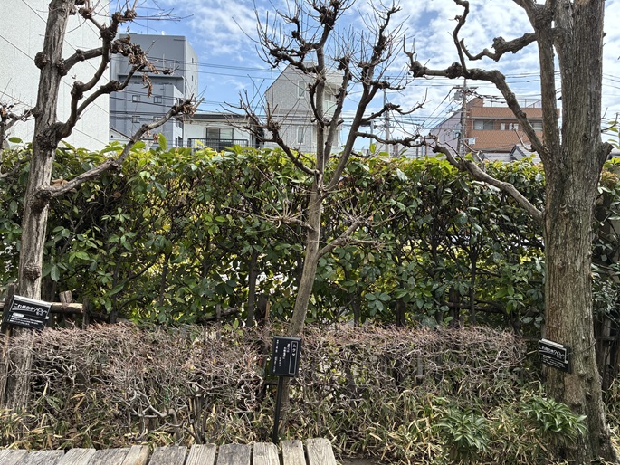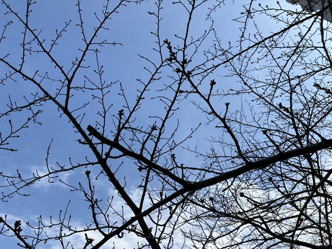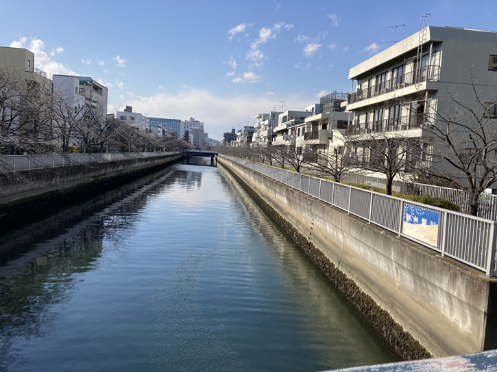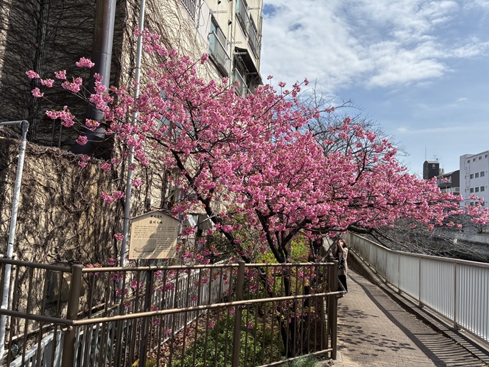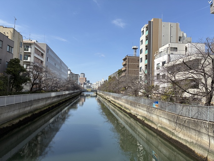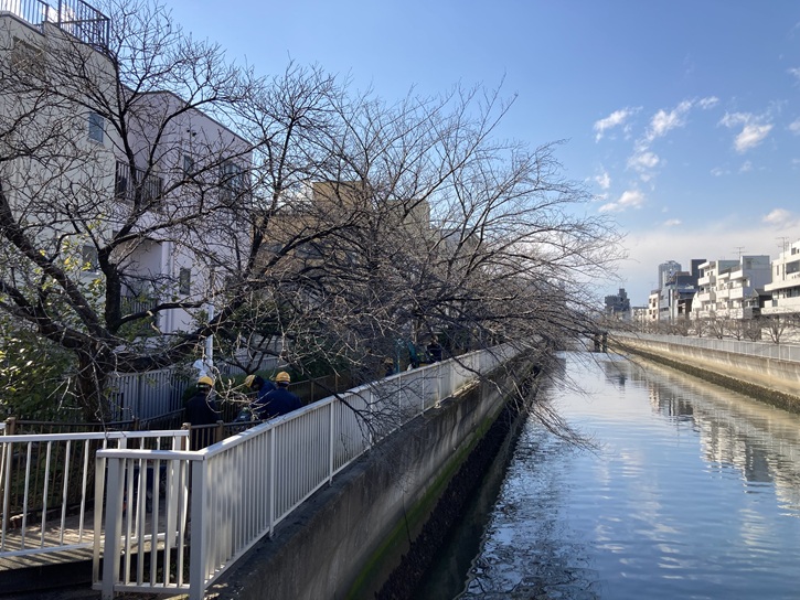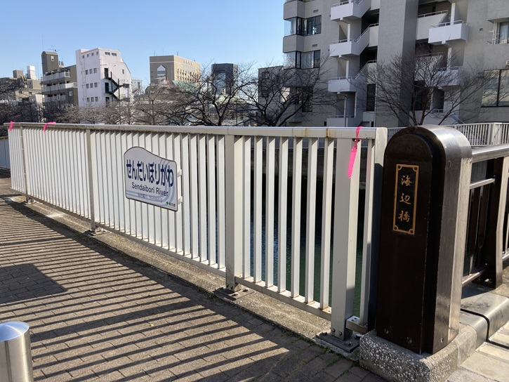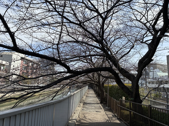 木更木橋を経て、海辺橋まで仙台堀川沿いの遊歩道を進みます。遊歩道の上には桜の木の枝が被さり、春には桜を愛でながらのお散歩が楽しめます。もう少しで開花ですね。