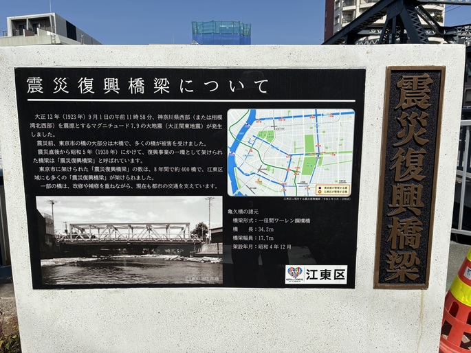 亀久橋は、関東大震災の復興事業の一環として架けられた「震災復興橋梁」のひとつです。