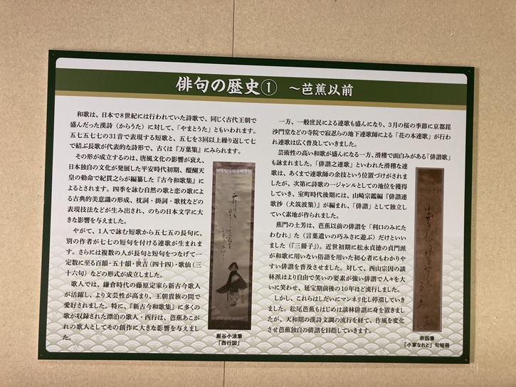俳句の歴史を解説したパネルが3枚貼られています。一枚目は芭蕉以前の歴史です。