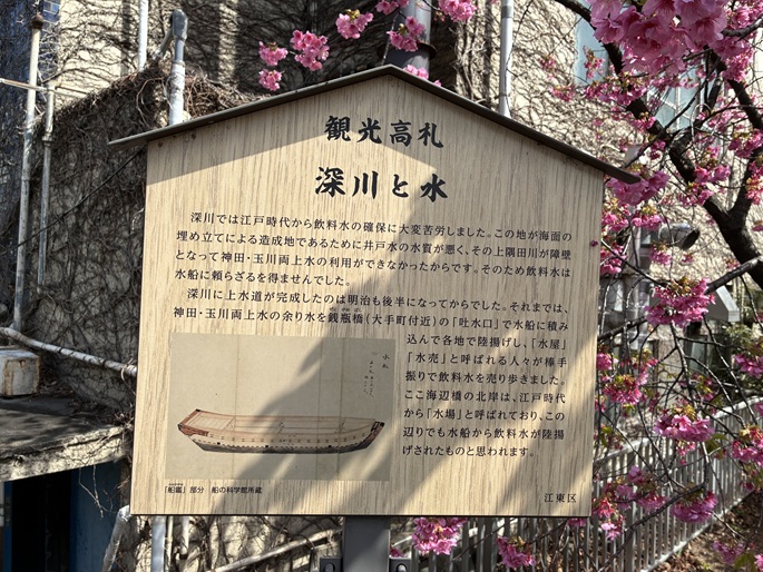 深川では江戸時代から飲料水の確保に大変苦労しました。この地が海面の埋め立てによる造成地であるために井戸水の水質が悪く、その上隅田川が障壁となって神田・玉川両上水の利用ができなかったからです。そのため飲料水は水船に頼らざるを得ませんでした。深川に上水道が完成したのは明治も後半になってからでした。それまでは、神田・玉川両上水の余り水を銭瓶橋(大手町付近)の「吐水口」で水船に積み込んで各地で陸揚げし、「水屋」「水売」と呼ばれる人々が棒手振りで飲料水を売り歩きました。ここ海辺橋の北岸は、江戸時代から「水場」と呼ばれており、この辺りでも水船から飲料水が陸揚げされたものと思われます。