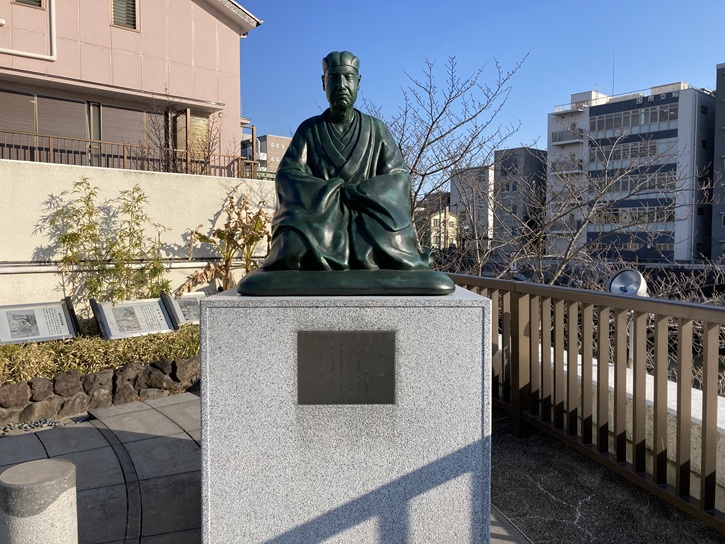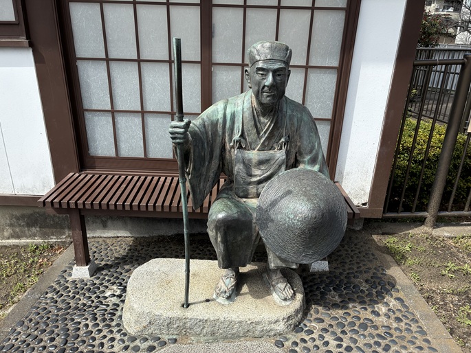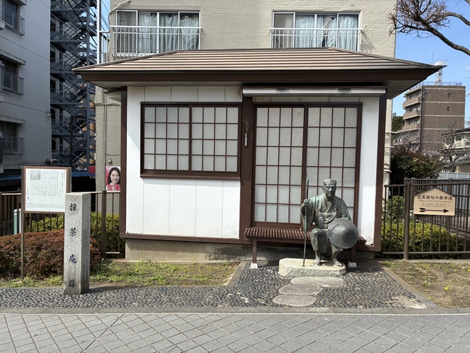 海辺橋の南西側袂に芭蕉縁の「採茶庵」を復元した小さな建物があり、奥の細道に出立する直前なのでしょうか、その縁台に腰掛けた旅装姿の松尾芭蕉の彫像が置かれています。