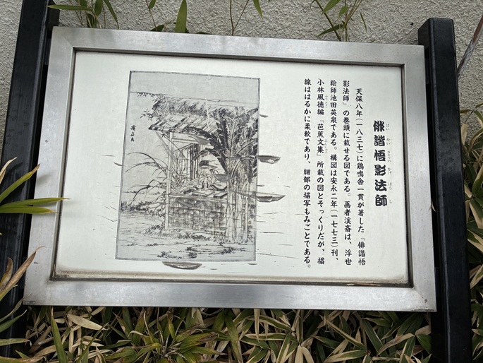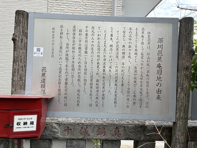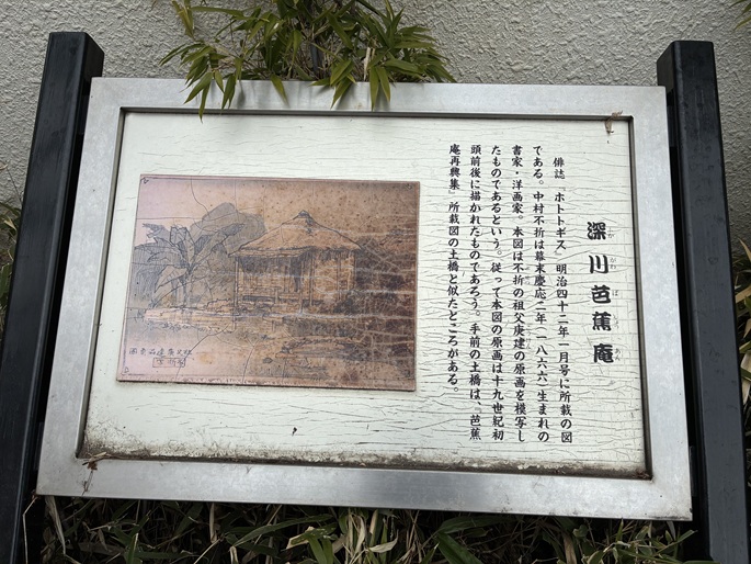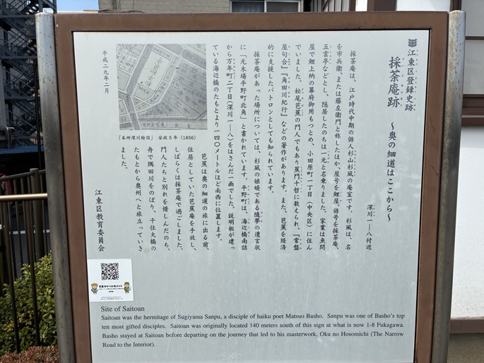 Saitoan was the hermitage of Sugiyama Sanpu, a disciple of haiku poet Matsuo Basho. Sanpu was one of Basho's top ten most gifted disciples. Saitoan was originally located 140 meters south of this sign at what is now 1-8 Fukagawa. Basho stayed at Saitoan before departing on the journey that led to his masterwork, Oku no Hosomichi (The Narrow Road to the Interior).