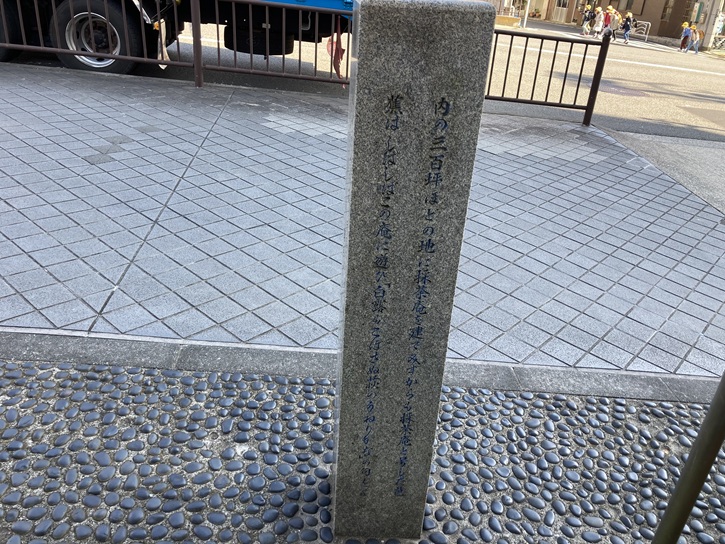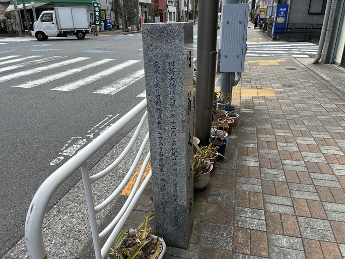 隅田川テラスから上がり、再び万年橋通りを北に進みます。歩道の脇に石柱が建っています。最初に新大橋が架橋されたのは元禄六年(1693年)で、「大橋」と呼ばれた両国橋に続く橋として「新大橋」と名付けられました。当時の橋は現在の位置よりもやや下流側にありました。その後、明治十八年(1885年)に新しい西洋式の木橋に架け替えられ、明治四十五年(1912年)7月19日にはピントラス式の鉄橋として現在の位置に生まれ変わりました。竣工後間もなく市電が開通し、アールヌーボー風の高欄に白い花崗岩の親柱など、特色あるデザインが見られました。現在の橋は、昭和五十二年(1977年)に架けられたものです。石碑には「旧新大橋跡」と書かれていますが、こういった経緯を見ると「新大橋」がどの時代の橋を指すのか分かりにくいですね。