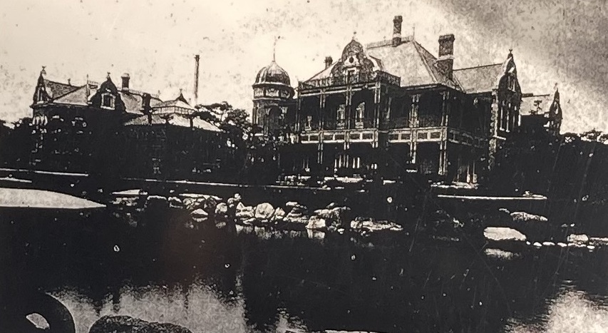 英国人建築技師ジョサイア・コンドルの設計監理によるもので、明治十九年(1886年)に着工して明治二十二年(1889年)に竣工しました。鹿鳴館時代の建築技術が生かされた建坪782坪(約2581u)で、鋳鉄製テラス、イスラム風ドーム、オランダ風の装飾破風などのデザインを有していました。しかし、大正十二年(1923年)の関東大震災の際に焼失してしまいました。