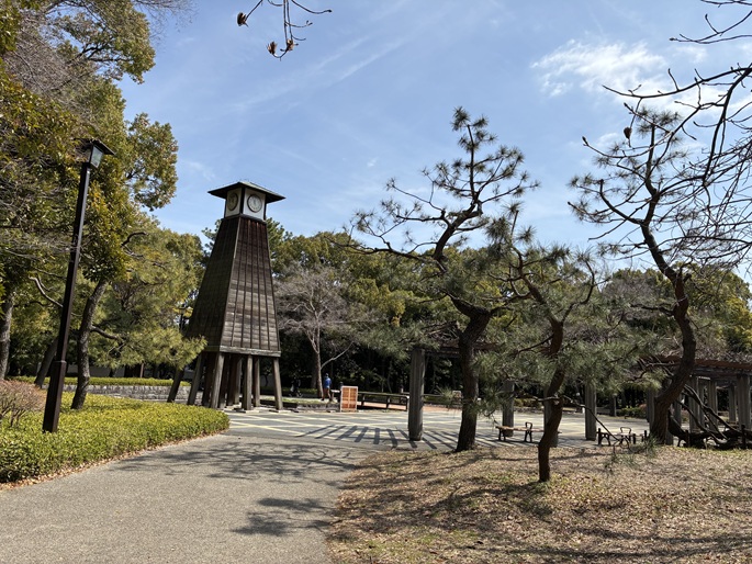 中央の芝生広場を囲んで桜の木が20本ほど植えられ、春のお花見の場ともなっています。公園入口に聳え建つ昔ながらの時計台が印象的です。公園内には子ども達が楽しめる遊具はさほど多くはありませんが、夏になると水が入る「ジャブジャブ池」があります。