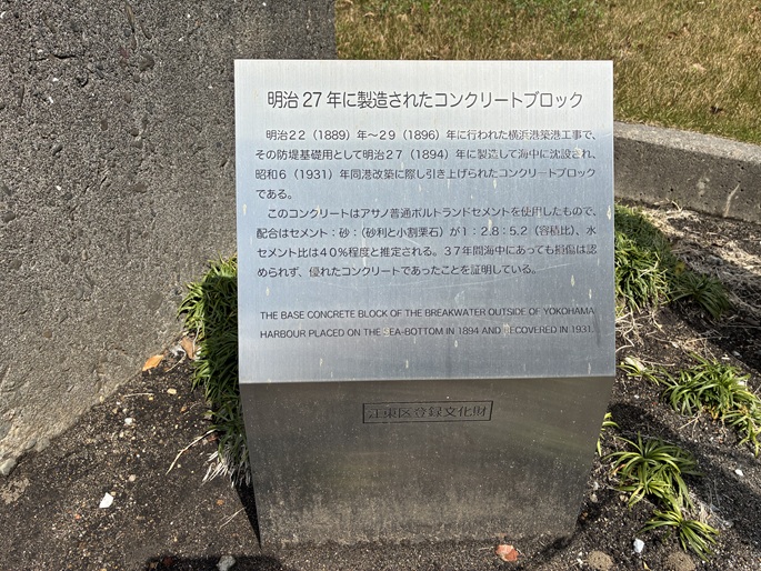 明治二十二年(1889年)〜明治二十九年(1896年)に行われた横浜港築港工事で、その防堤基礎用として明治二十七年(1894年)に製造して海中に沈設され、昭和六年(1931年)同港改築に際し引き上げられたコンクリートブロックである。このコンクリートはアサノ普通ポルトランドセメントを使用したもので、配合はセメント:砂:(砂利と小割栗石)が1:2.8:5.2(容積比)、水セメント比は40%程度と推定される。37年間海中にあっても損傷は認められず、優れたコンクリートであったことを証明している。