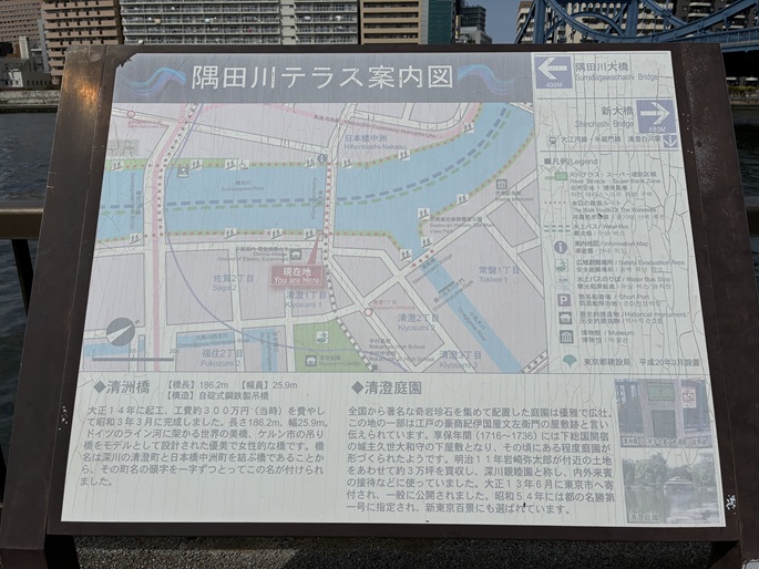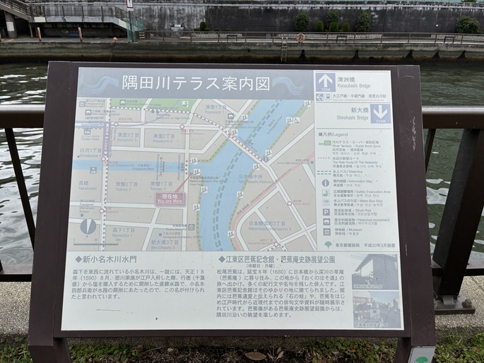 仙台堀川が隅田川に合流する地点に、清澄排水機場排水樋門があり、その脇から隅田川テラスに下ります。清澄排水機場は、地盤沈下の著しい江東三角地帯を水害から守り、合わせて環境の整備を行う「江東内部河川整備事業」の一環として建設された外郭ポンプ施設です。台風などによる高波や地震による津波のときは排水樋門が閉鎖されます。このときに降った雨は下水道から内部河川に排水されます。この排水機場は内部河川に降った雨を外海(隅田川)に吐出して溢れることを防ぐ役目を果たします。隅田川テラスは、堤防を補強する護岸基礎を親水施設として開放した場所です。現在、隅田川テラスは隅田川の両岸約47kmの内、約36kmの区間で整備され、都心の貴重な水辺空間として多くの人たちに利用されています。