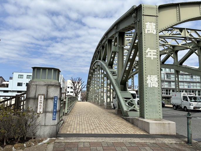 小名木川が隅田川に合流する地点に萬年橋が架かっています。萬年橋は関東大震災後の震災復興橋梁のひとつです。