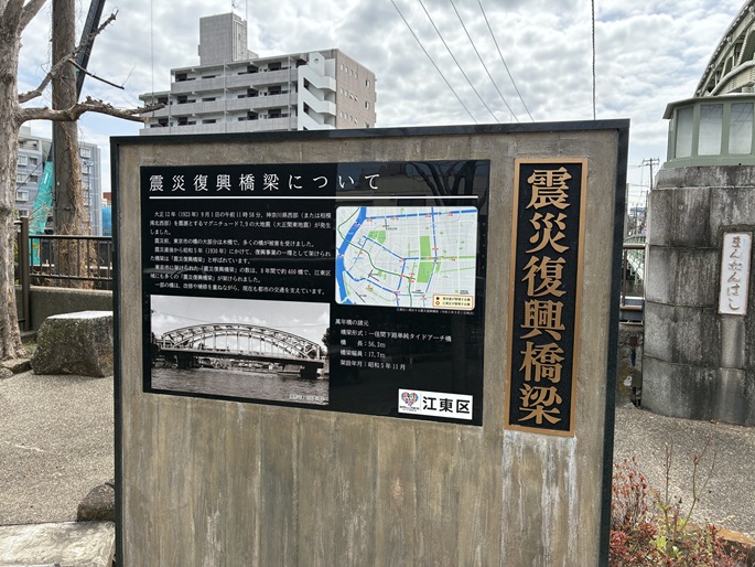 大正十二年(1923年)9月1日の午前11時58分、神奈川県西部(または相模湾北西部)を震源とするマグニチュード7.9の大地震(大正関東地震)が発生しました。震災前、東京市の橋の大部分は木橋で、多くの橋が被害を受けました。震災直後から昭和五年(1930年)にかけて、復興事業の一環として架けられた橋梁は「震災復興橋梁」と呼ばれています。東京市に架けられた「震災復興橋梁」の数は、8年間で約400橋で、江東区域にも多くの「震災復興橋梁」が架けられました。一部の橋は、改修や補修を重ねながら、現在も都市の交通を支えています。