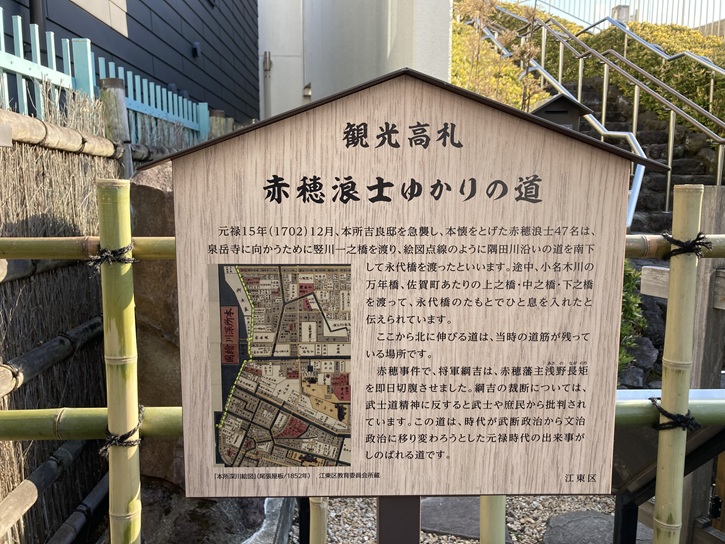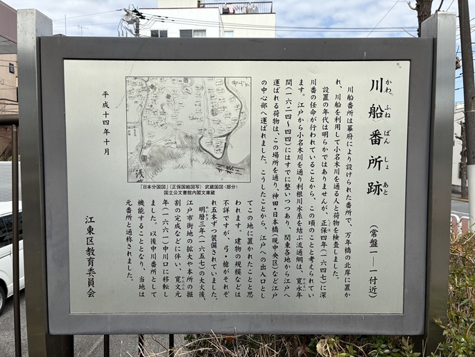 萬年橋の袂に川船番所跡の案内板があります。川船番所は当初この地点に置かれたのですが、その後旧中川と接続する番所橋付近に移されました。
