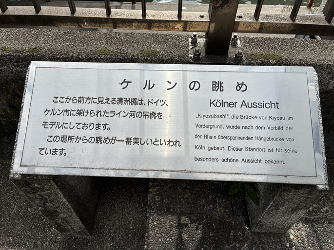 大正十四年に起工、工費約300万円(当時)を費やして昭和三年3月に完成しました。長さ186.2m、幅25.9m。ドイツのライン河に架かる世界の美橋、ケルン市の吊り橋をモデルとして設計された優美で女性的な橋です。橋名は深川の清澄町と日本橋中洲町を結ぶ橋であることから、その町名の頭字を一字ずつとってこの名が付けられました。