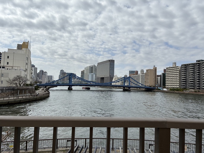 再び、隅田川テラスに下ります。上流には新大橋が架かっています。