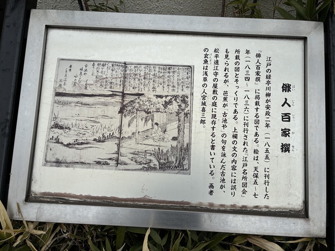 江戸の緑亭川柳が安政二年(1855年)に刊行した「俳人百家撰」に掲載する図である。絵は、天保五年〜天保七年(1834年〜1836年)に刊行された「江戸名所図会」所載の図とそっくりである。上欄の文の内容には誤りも見られるが、芭蕉が「古池や」の句を詠んだ古池が、松平遠江守の屋敷の庭に現存すると書いている。画者の玄魚は浅草の人宮城喜三郎。