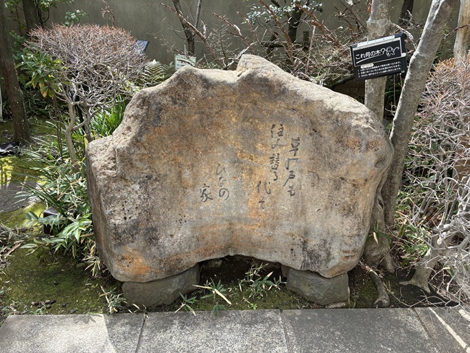 館内に入りますと、庭園には芭蕉の句に詠まれた草木が植えられていて、四季折々の草花を楽しめます。また、園内には句碑も置かれています。句碑には、「草の戸も 住み替る代ぞ ひなの家」と書いてあります。芭蕉は「奥の細道」の旅へ出発する前月、9年間住んだ芭蕉庵を人に譲り、採荼庵に転居して旅の準備をしました。「住み慣れてきたこのみすぼらしい草庵も住み替わるべき時がきた。誰かあとで引っ越してくる人が、おひなさまを飾って華やかになることがあるだろう。」といった意味です。「代」とは、「時期・季節」のことです。