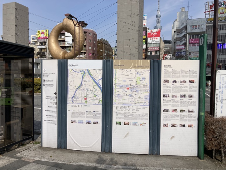 駅前広場に面して、墨田区の巨大な観光案内板が立っています。今回のコースに含まれる弘福寺と長命寺を抜き出してみます。