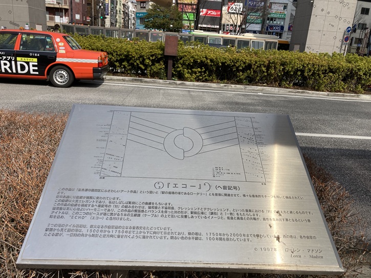この作品は「音楽都市墨田区にふさわしいアート作品」という狙いと「駅の循環の場であるロータリー」とを密接に関連させて、様々な音楽的モチーフを用いて構成されています。従来楽譜には曲線が頻繁に使われています。この曲線は大変エレガントであり、私はしばしば彫刻にこの曲線をもちいます。この作品の曲線を構成するへ音記号の「対」の組み合わせは、協和音と不協和音、クレッシェンドとデクレッシェンド、といった音楽における「対」の考え方と通じるものです。協和音は耳に心地よいハーモニーであり、この作品の緊張感とバランスを保った対の形が、駅前広場に「調和」と「一致」をもたらします。タイトルは、この二つのピースが塔に繋がる5本の五線譜(ケーブル)の上で互いに反響しあっているイメージと、低音と高音との共鳴が、音色を生み出す源となるという意味を込め、”ECHO”(エコー)と名付けました。2つの塔のタイル模様は、偉大なる作曲家達の主なる音楽史をたどっています。駅側から見て西の塔は、1500年から1750年まで上から下に向けて示されており、東の塔は、1750年から2000年までを表わしています。西の塔は、各作曲家のたどる線が、一番南の角から時計と逆方向に巻き付くように描かれています。明るい色の水平線は、100年間を表わしています。