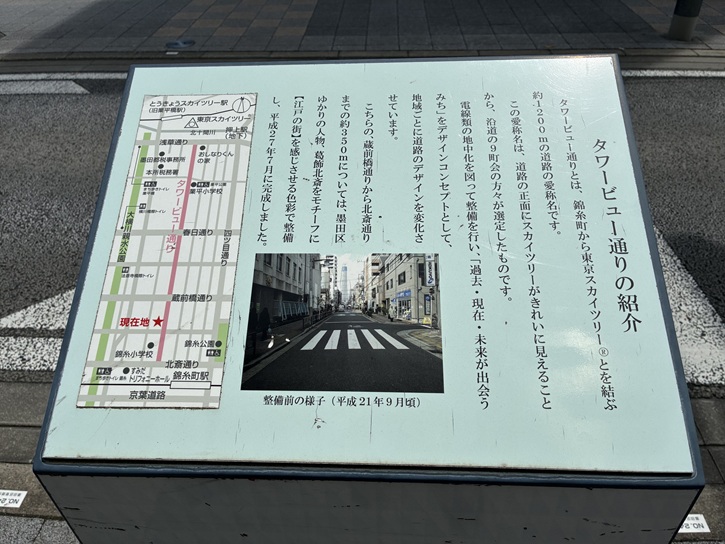 タワービュー通りとは、錦糸町から東京スカイツリーとを結ぶ約1200mの道路の愛称名です。この愛称名は、道路の正面にスカイツリーがきれいに見えることから、沿道の9町会の方々が選定したものです。電線類の地中化を図って整備を行い、「過去・現在・未来が出会うみち」をデザインコンセプトとして、地域ごとに道路のデザインを変化させています。こちらの、蔵前橋通りから北斎通りまでの約350mについては、墨田区ゆかりの人物、葛飾北斎をモチーフに【江戸の街】を感じさせる色彩で整備し、平成二十七年7月に完成しました。