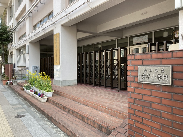 通りの右手に、世界のホームラン王と称された王選手の母校の業平小学校があります。