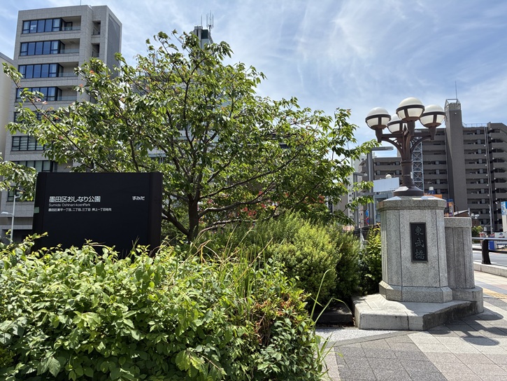 東武橋を渡った右手に、北十間川に沿って細長く続く「おしなり公園」があります。公園の名前は、スカイツリーのすぐ下に広がる商店街のイメージキャラクター「おしなりくん」に因んでいます。ひょとして、おしなりくんはホームレスになって公園で寝泊まりしているのかも。