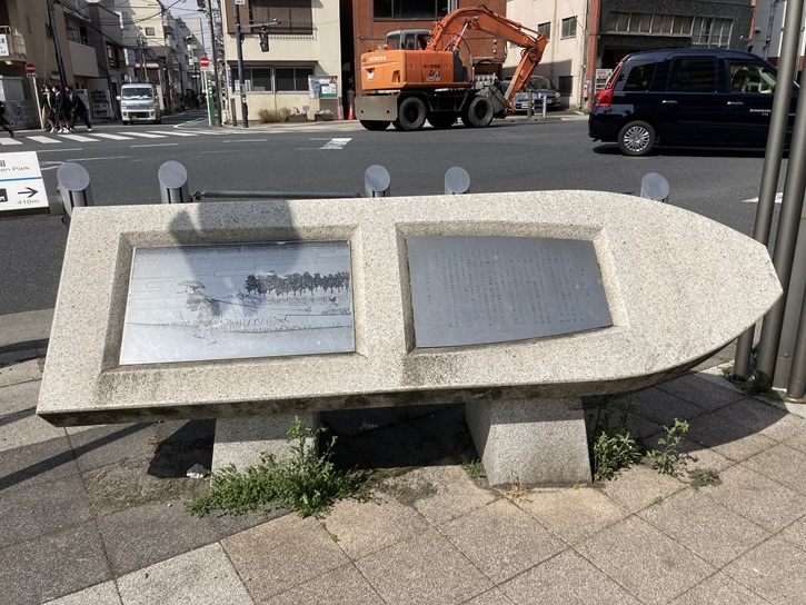 スカイツリーの先で曳舟川通りに入ります。交差点の角に舟形をしたコンクリート製の案内碑が置かれています。
