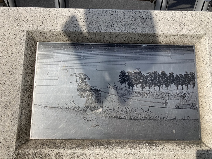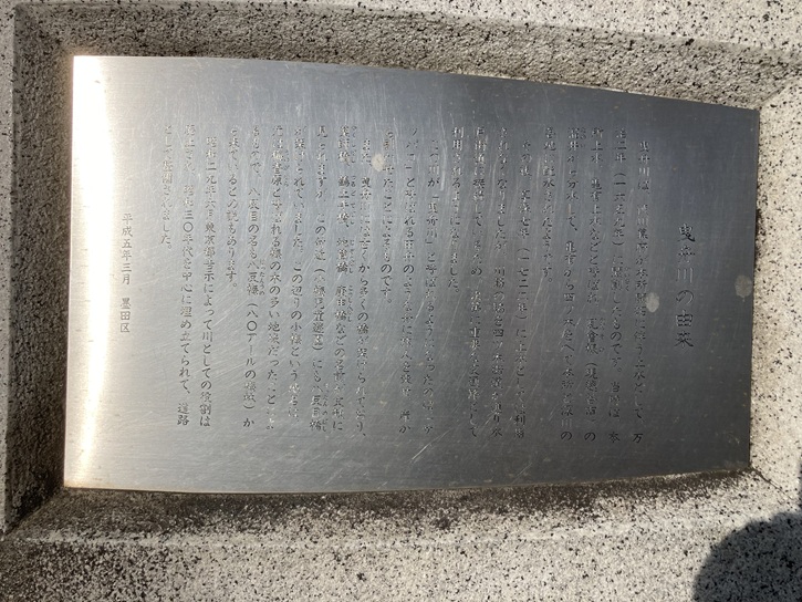 これは広重の「木母寺内川御前栽畑(名所江戸百景)をレリーフにしたものです。徳川将軍の食膳に供する野菜を栽培する畑を御前栽畑といい、ここの内川(入江)を船で出入りすることができました。