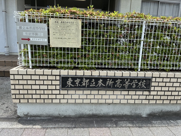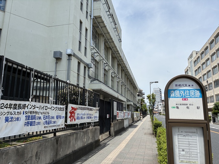 本所高等学校の手前に案内板が立っています。普通なら「本所高等学校前」とするのでしょうけど、このバス停は「森鴎外住居跡」になっています。本所高等学校に用事のある乗客は下車ボタンを押し忘れるかも。