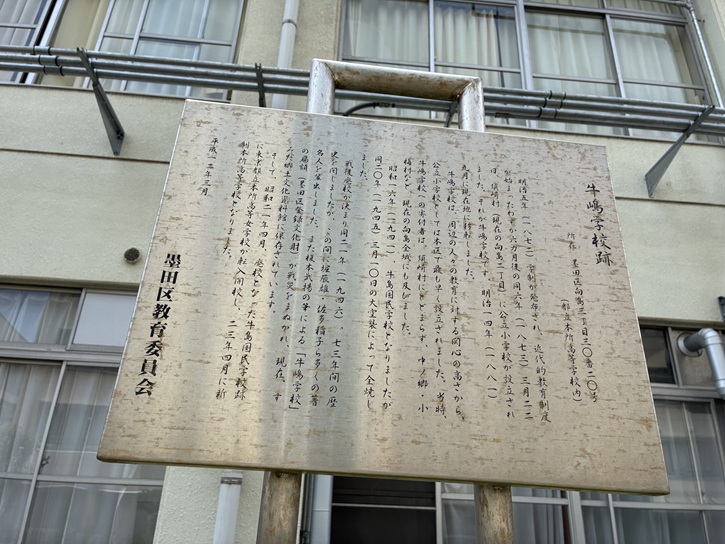 明治五年(1872年)学制が発布され、近代的教育制度が始まったわずか六ヶ月後の同六年(1873年)三月二十二日、須崎村(現在の向島二丁目)に公立小学校が設立されました。それが牛嶋学校です。明治十四年(1881年)九月に現在地に移転しました。牛嶋学校は、周辺の人々の教育に対する関心の高さから、公立小学校としては本区で最も早く設立されました。当時、牛嶋学校への寄付者は、須崎村にとどまらず、中ノ郷・小梅村など、現在の向島全域にも及びました。昭和十六年(1941年)、牛島国民学校となりましたが、同二十年(1945年)三月十日の大空襲によって全焼しました。戦後廃校が決まり同二十一年(1946年)、七十三年間の歴史を閉じましたが、この間に堀辰雄・佐多稲子ら多くの著名人を輩出しました。また榎本武揚の筆による「牛嶋学校」の扁額(墨田区登録文化財)が戦災をまぬがれ、現在、すみだ郷土文化資料館に保存されています。そして、昭和二十一年四月、廃校となった牛島国民学校跡に東京都立本所高等女学校が転入開校し、二十三年四月に新制本所高等学校となりました。