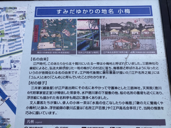 江戸時代、このあたりから北十間川にいたる一帯は小梅村と呼ばれていました。三囲神社の縁起によると、弘法大師が投じた一粒の梅がこの付近に落ち、梅香原と呼ばれるようになったというのが巷間伝わる名の由来です。江戸時代後期に鍬形寫ヨが描いた「江戸名所之絵」には「コムメ」とあり「こんめ」と呼んでいたことがわかります。