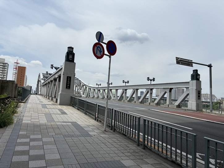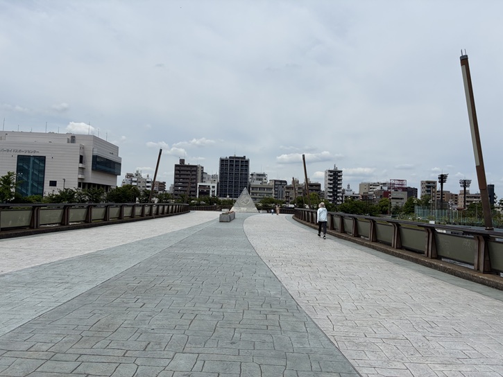 隅田川の堤防に設けられた階段を上がりますと、目の前に桜橋が架かっています。桜橋はX字型の人道橋で、昭和六十年(1985年)に架橋されました。