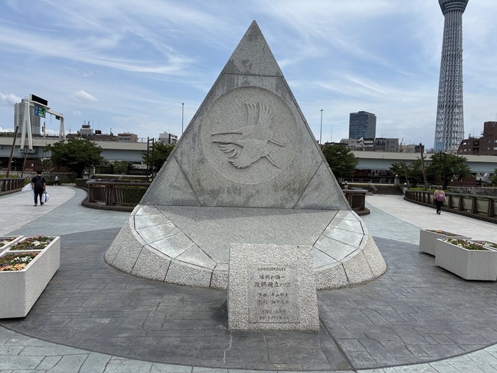 左右の歩道が交わる広場の両端には、架橋10周年を記念して設置された巨大な石碑が建っています。シルクロード画家で知られる平山郁夫氏が原画を担当し、二羽の鶴をモチーフにしたレリーフが埋め込まれた「瑞鶴の図 双鶴飛立の図」です。