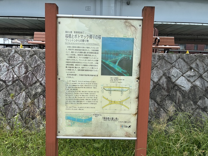 In constructing this bridge, some cherry trees were sent from Washington D. C. The cherry trees of Potomac riverside of Washington D. C. is one of the famous place in the world. The end of Meiji era, Mrs. President Taft visited Tokyo. She was fascinated with the cherry blossoms in Mukojima, and hoped to plant cherry trees in Washington D. C. In response to her wish, Mayer of Tokyo city, Yukio Ozaki presented it to Washington D.C. After about 70 years, the posterity of cherry trees has returned to the ground in Mukojima.