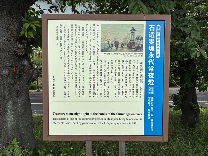 石造墨堤永代常夜燈は、高さ五メートルを超え、琴柱状の脚が特徴的です。天辺の宝珠部分には牛嶋神社の社紋があり、基台上段には同神社の地位を表す「本所惣鎮守」の銘が彫刻されています。また、石組基壇には「永代常夜燈」の銘と「石工宮本平八」の名前を刻んだ石製プレートがはめ込まれています。東京府文書によれば、この常夜燈は、江戸近郊の名所の演出にあずかってきた牛嶋神社の氏子十七名、具体的には植半や八百松、武蔵屋など有名料亭の主人たちの発意によって設置されたようです。明治四年(1871年)の牛嶋神社の臨時祭に併せて奉納されたもので、元来は墨堤から牛嶋神社旧地(弘福寺西隣)へ下りる坂の頂にありました。設置当時、この付近は夜になると真っ暗だったそうで、常夜燈の火が貴重な明かりとして利用されたことがうかがわれます。発起人十七名が東京府へ提出した設置許可申請書にも、この付近を通行する人々の役にも立つはずだとの思いがしたためられています。この常夜燈は、設置以来、墨堤を代表する風物詩の一つとして絵画にも描かれるなどしてきました。平成二十八年七月二十一日、墨田区指定有形文化財に指定されました。