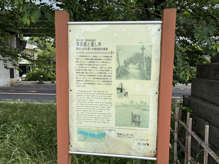 この常夜燈の置かれている場所は、かつて牛嶋神社の境内地でした。牛嶋神社は隅田公園の整備とともに現在地に移転しましたが、この常夜燈だけはここに残されました。それは墨堤における重要な目印であったためです。この付近にはかつて「竹屋の渡し」が設けられ、春の花見や夏の花火見物、明治に入ってからは向島の花柳界へと遊興客を数多く運んできました。まだ照明が発達していないこの時代にはこの常夜燈の明かりが非常に重要な役割を果たしていました。また、明治の画家達は墨堤の桜とこの常夜燈を好んで組み合わせることにより、向島の風情を描きました。当時の向島の格好のシンボルとしてその姿を今に伝えています。