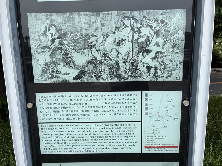 葛飾北斎晩年期の傑作といわれている、縦1.2m余、横2.8mに及ぶ大きな板絵です。北斎は弘化二年(1845年)頃、牛嶋神社(現在向島1丁目)付近に住んでいたと伝えられ、「須佐之男命厄神退治之図」を奉納しました。この作品は悪病をもたらす厄神たちに今後は悪事を働かないように須佐之男命が証文を書かせている場面を描いたものです。画面右下には「前北斎卍筆 齡八十七歳」の落款があります。残念ながら大正十二年(1923年)、関東大震災で消失してしまいましたが、現在は原寸大の復元パネルが牛嶋神社の社殿に飾られています。