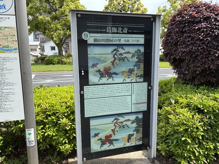鐘ヶ淵陸橋交差点の角に、葛飾北斎の「富嶽三十六景 隅田川関屋の里」のパネルが立っています。関屋の里は「江戸名所図会」によれば、木母寺より北の牛田村の隅田川に面した一帯を指しています。疾駆する三騎連れの武士は領国への急を知らせる早馬でしょうか。早朝の朝駆けの使者の気ぜわしさが感じられます。馬や武士たちの服の色は異なり、華やかな色どりさえ感じさせます。躍動感のある近景に対して、静かで雄大な赤富士を遠景に持ってきた北斎の構図が窺えます。