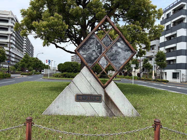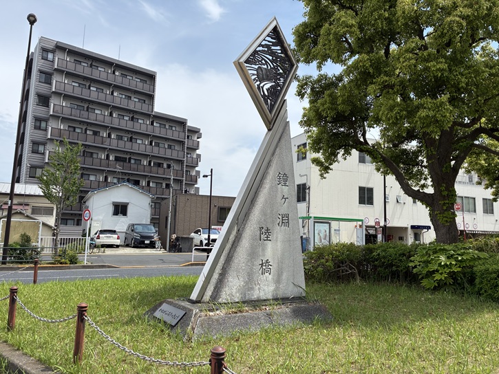 墨堤通りは鐘ヶ淵陸橋交差点の下をアンダーパスで潜っていますので、交差点は陸橋のようになっています。交差点の中央にある分離帯の南側に三角形、北側に菱形のモニュメントが建っています。