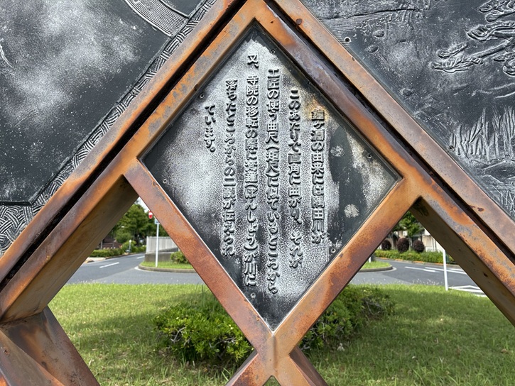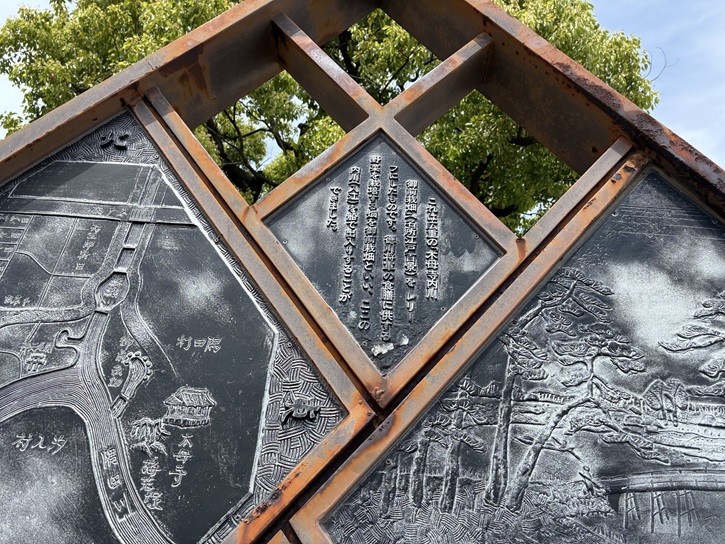 北側の菱形のモニュメントには、「鐘ヶ淵」の地名の由来を図解したレリーフと、安藤広重の「名所江戸百景 木母寺内川御前栽畑」のレリーフが組み込まれています。