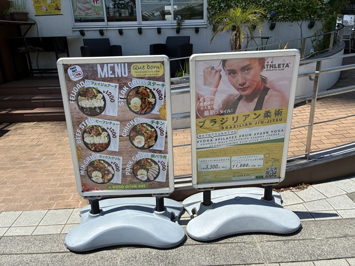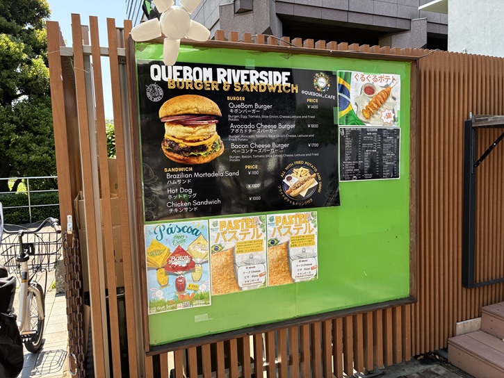 1階にはアットホームで陽気なブラジリアンカフェの「que bom!」があり、隅田川に面してテラス席もあります。シュハスカリアキボンのお肉を使ったお弁当をはじめ、ポンデケージョやアサイーなどキボン!ならではのメニューが揃っていて、開放的な雰囲気で気持ち良く過ごせます。2階はブラジリアン柔術の道場もあるようです。